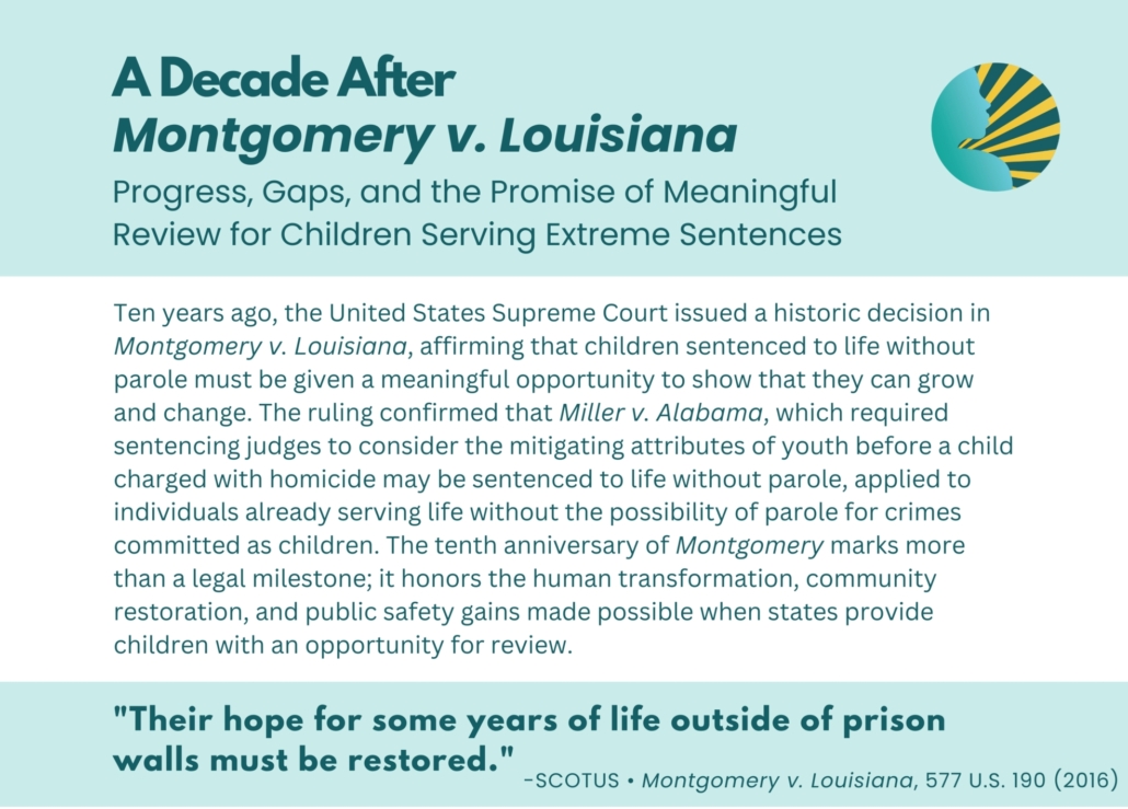 Published January 23, 2025 the report A Decade After Montgomery v. Louisiana: Progress, Gaps, and the Promise of Meaningful Review for Children Serving Extreme Sentences  examines the impact of the U.S. Supreme Court’s landmark 2016 decision.